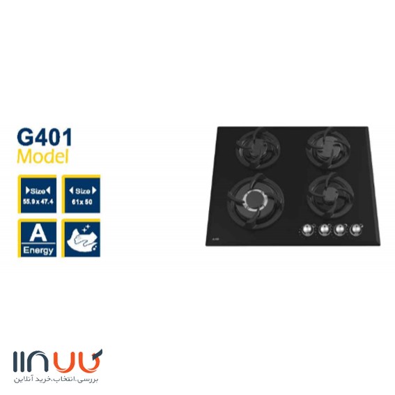 اجاق گاز شیشه ای 4 شعله آلتون مدل G401 ، در ابعاد 50*61 سانتی متر از طراحي زيبايي برخوردار است که داراي جنس شيشه مشکي سکوريت نشکن و ولوم فلزی می باشد. اين اجاق مجهز به شير ترموکوپل دار فوق سريع و سر شعله پلوپز با راندمان بالا مي باشد. همچنین دارای گارانتی 24 ماه الباگاز و گرید مصرف انرژی A است.